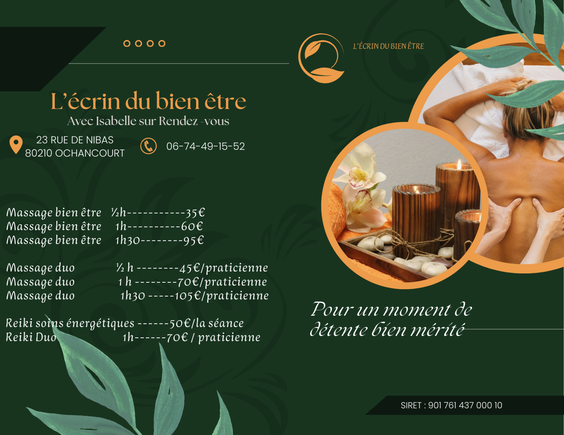 Pendant votre séjour chez nous ,laissez vous tenter pour profiter d'un moment agréable avec une séance de massage en solo ou en duo avec "L' écrin du bien être" .Pensez à prendre rendez vous auprès d'Isabelle au 06-74-49-15-52.